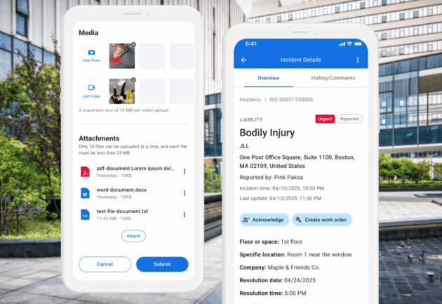 Your security guards and staff can now create complete incident reports directly from their mobile devices, eliminating the need to return to their desks for documentation. Teams can capture photos and videos on-site for comprehensive evidence collection and generate linked work orders instantly to ensure rapid response and resolution of property issues.